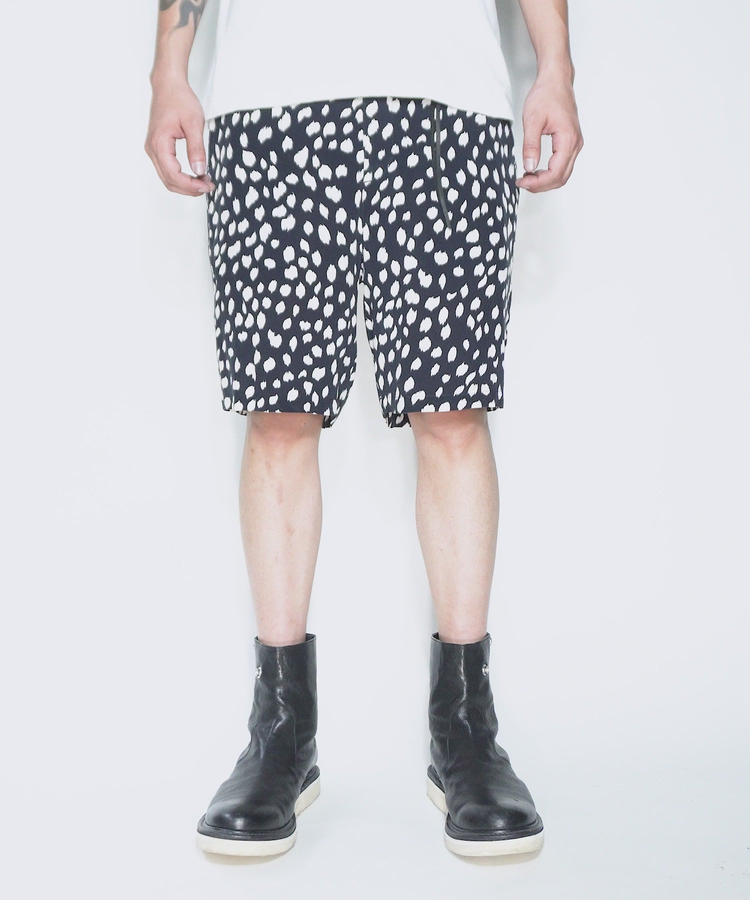 シルエットはタイトめながら細すぎず、程よいバランス。丈はヒザ上に設定したショートパンツです。