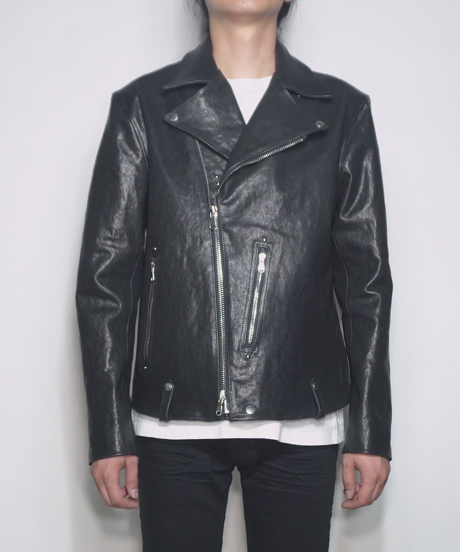 傷とシボ感でインパクトのある表情に仕上げた、骨っぽさがありながら着心地も重視したレザー。