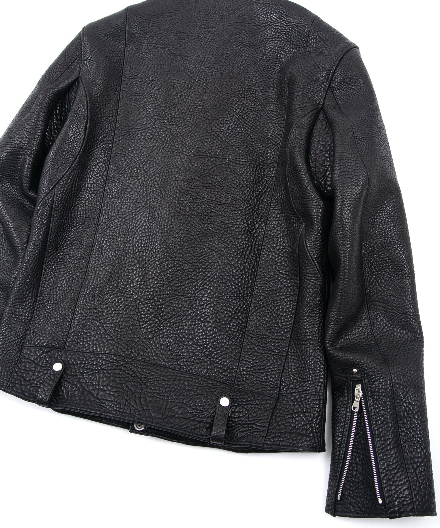 The leather is pit-tanned and has a firm, fibrous luster and a bony appearance. The leather is reduced to half its normal size to give it the maximum amount of grain, giving it an impactful look.