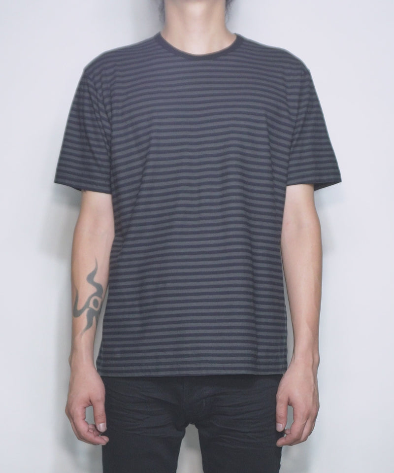 High Twisted Yarn Cotton Single Jersey Stripes Crew Neck T-shirt (Just Fit) - BLACK × GRAY