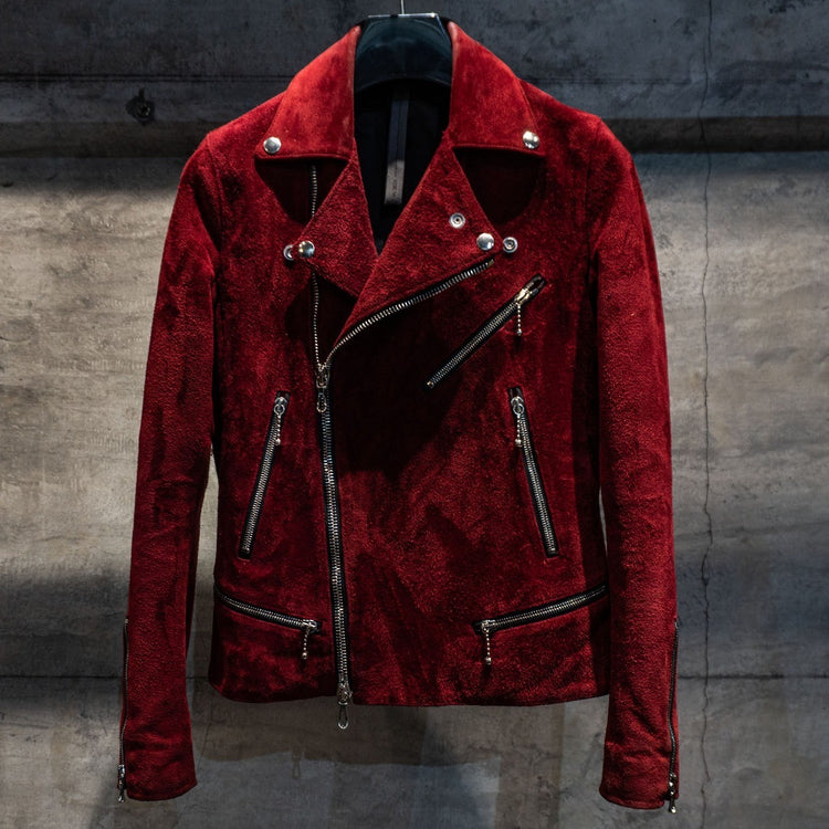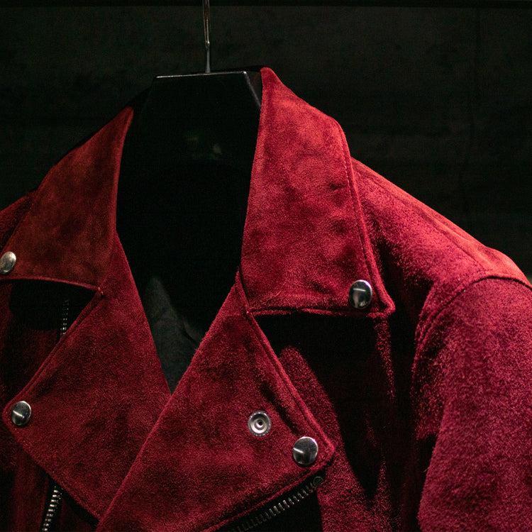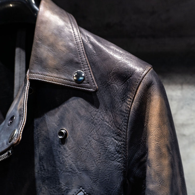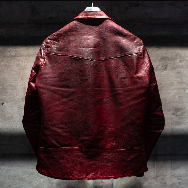 この初期のBurning dyed地生フルタンニン カーフ ダブルライダースジャケットはトラ柄が美しい地生のカーフ牛革原皮を日本国内でタンニン鞣しした革を使用している為、着込めば着込むほど、しなやかに体に合わせ馴染み柔らかくなり、味や風合いが増すのが特徴で、着込んでいるうちにさらに深い赤が鮮血のようなドス黒い赤に変化して唯一無二の存在になりました