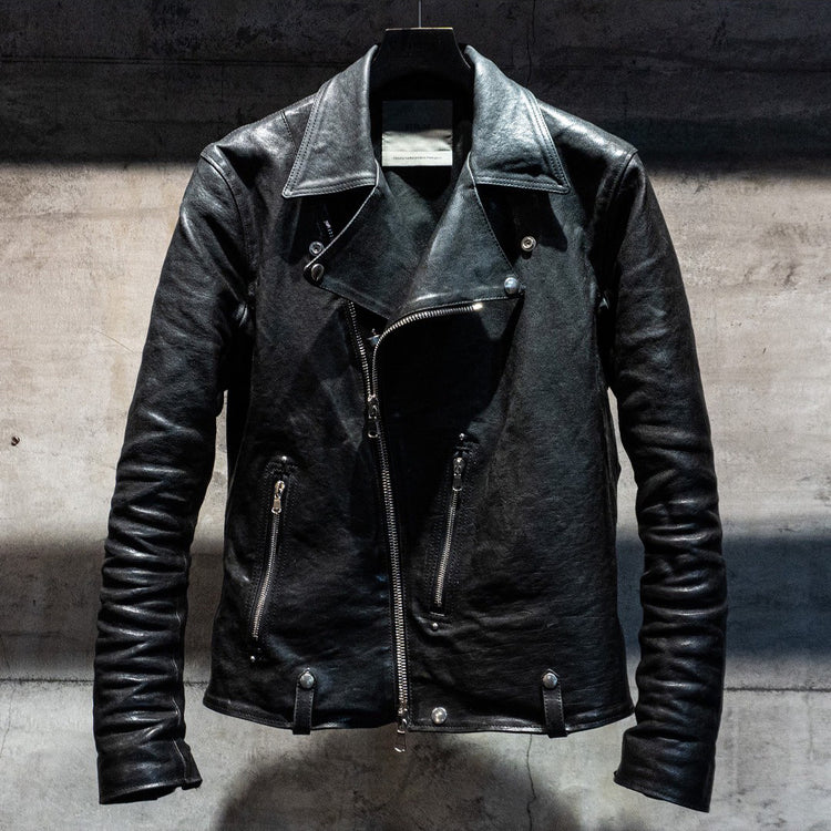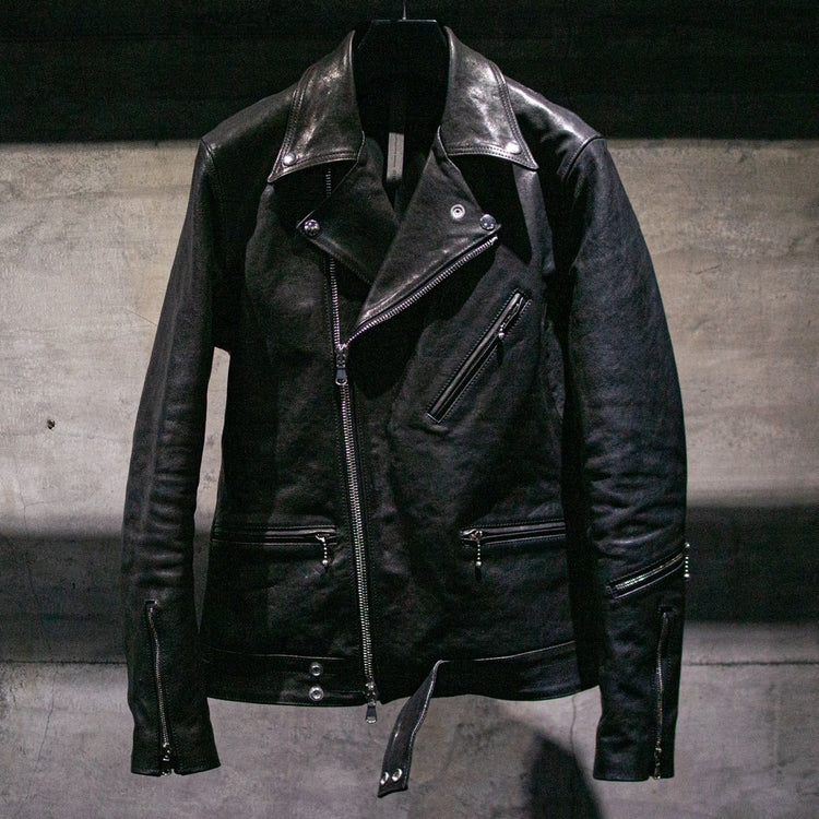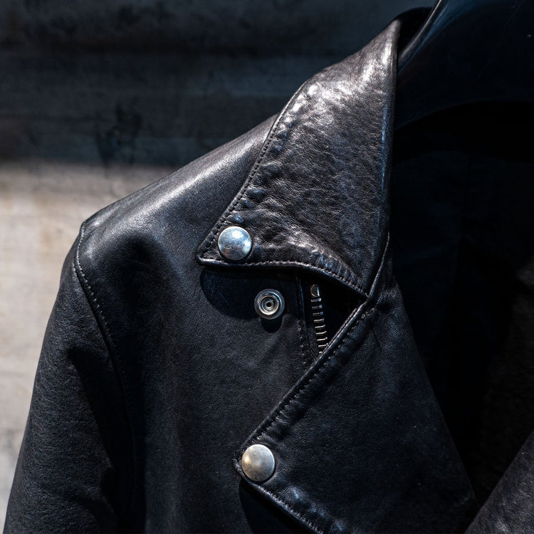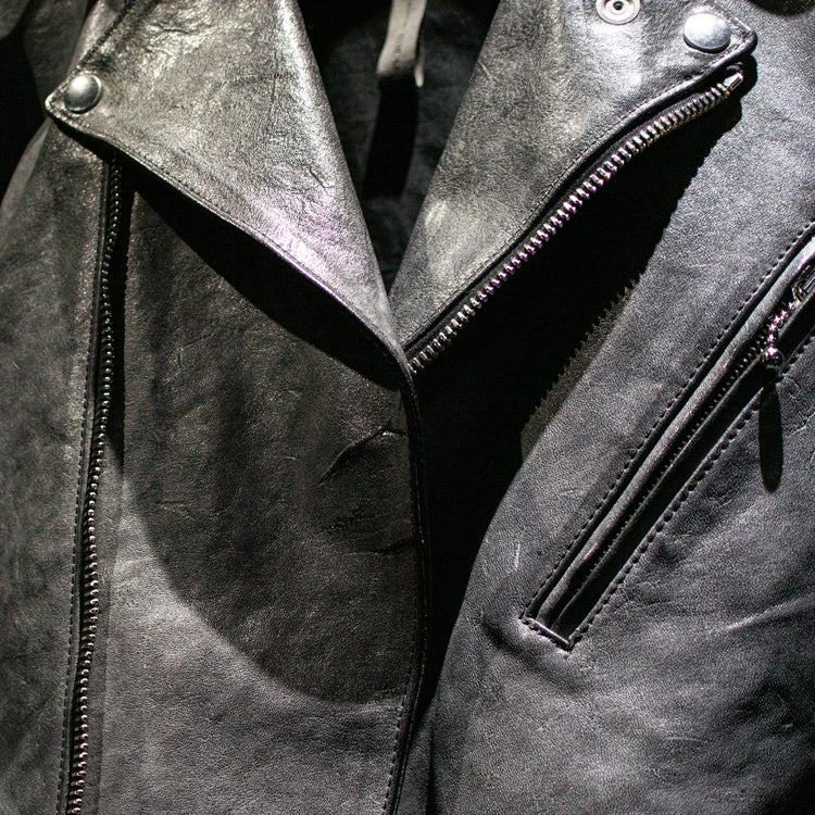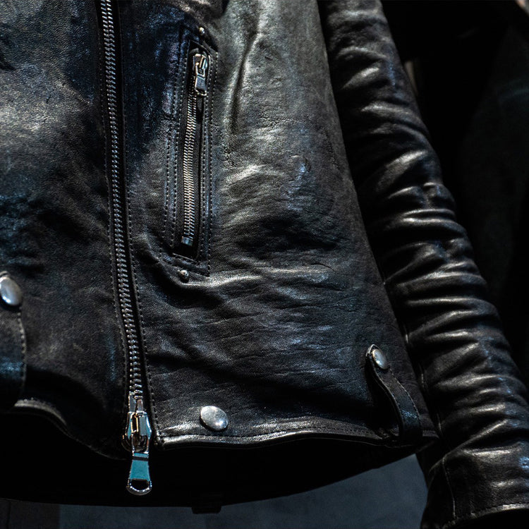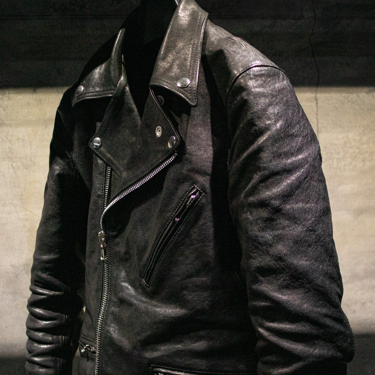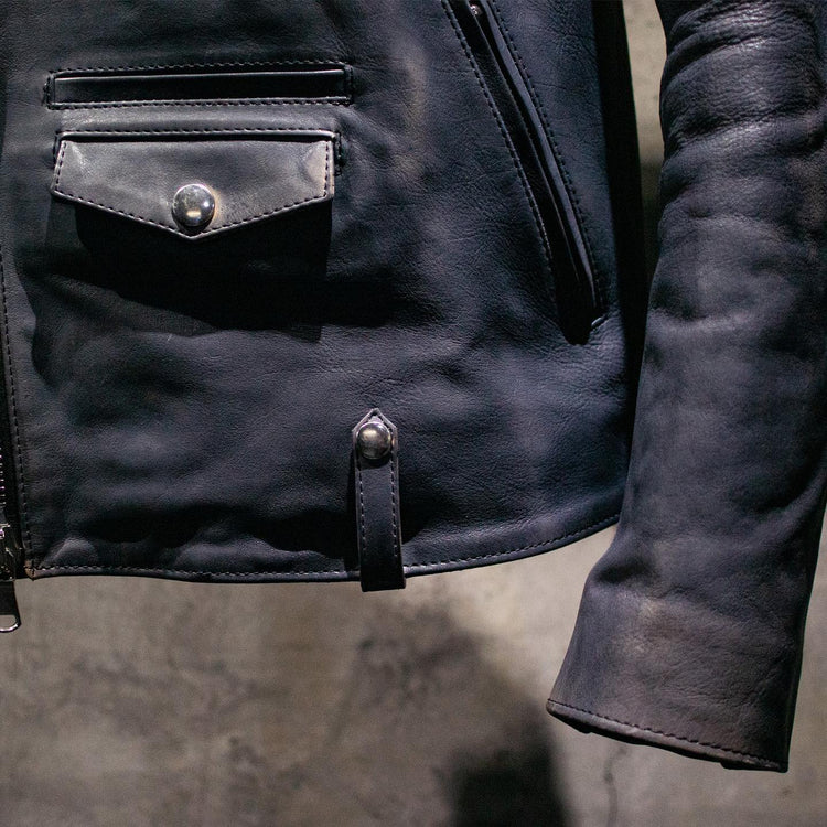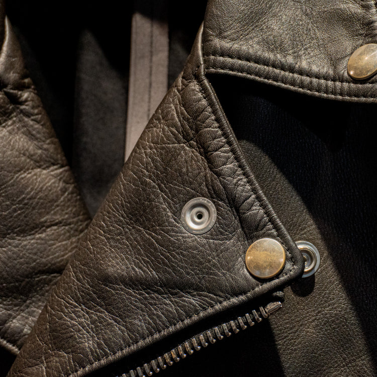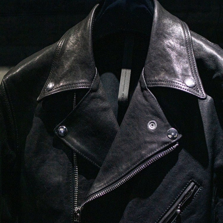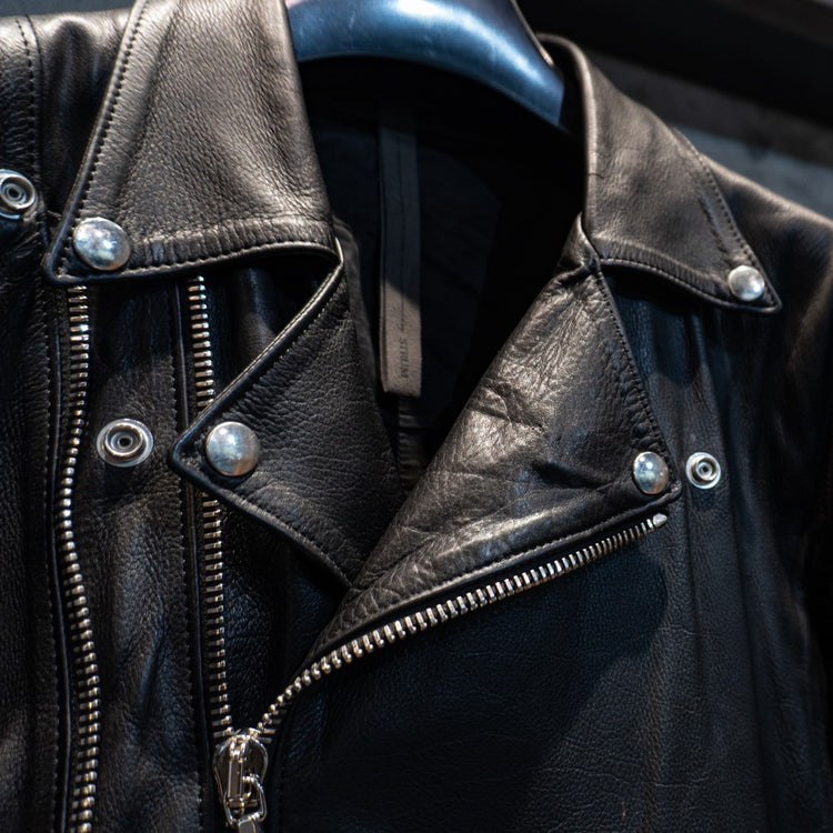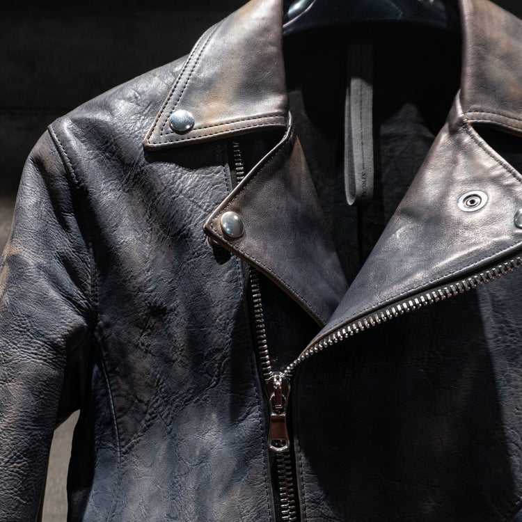 純粋な黒ではなく、墨染めならではの、立体感のある黒に惹かれて手に入れた 2着目のSTRUMのライダースジャケット。
