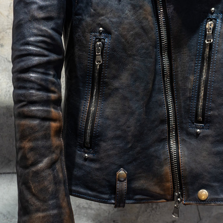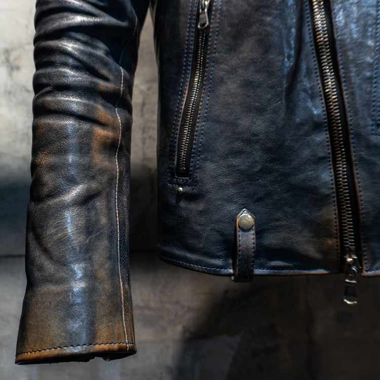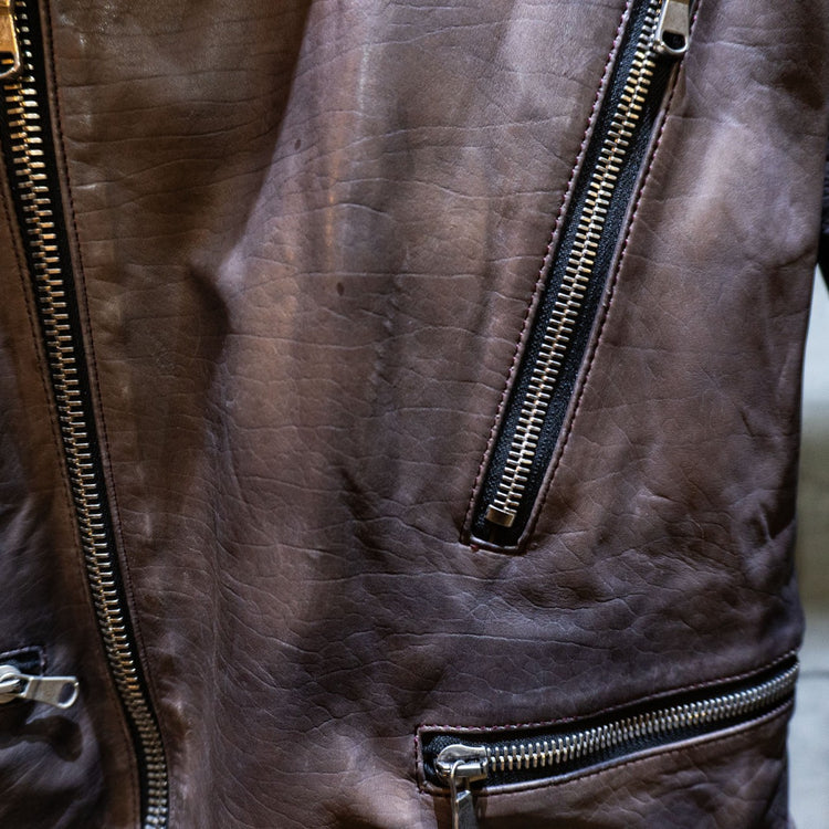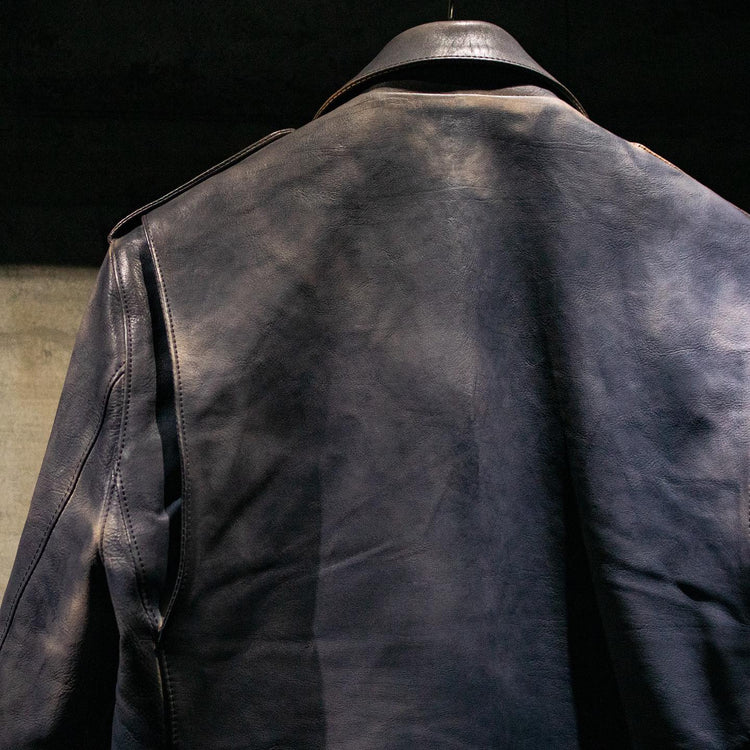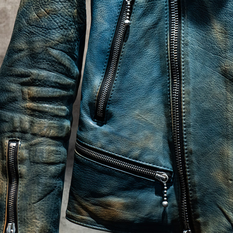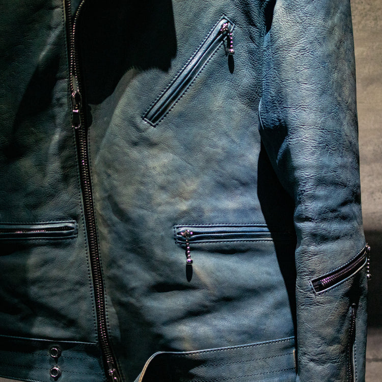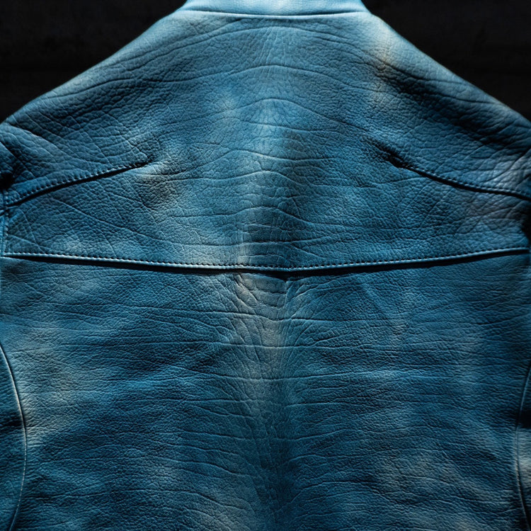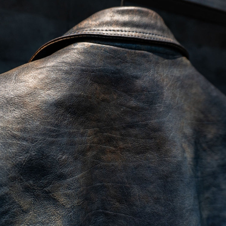 STRUMのレザーは食用の副産物の皮から作られ、人間が生きるために命を頂いた動物たちの皮も無駄にせず、動物への感謝も込めて一点一点丹精込めて作る、という理念が現れたかのような色合いになり、全てを包括する母なる地球に対する感謝を再認識させてくれた革ジャン。