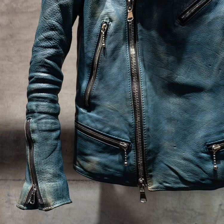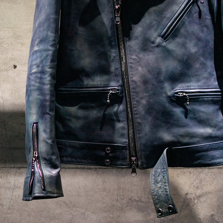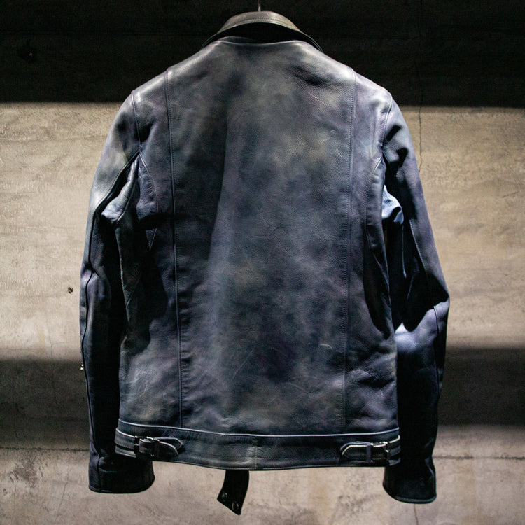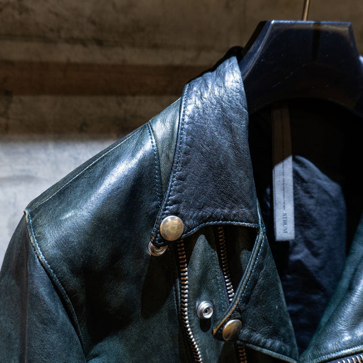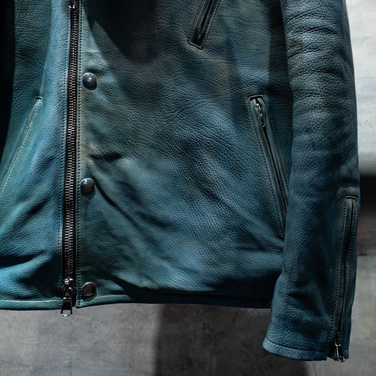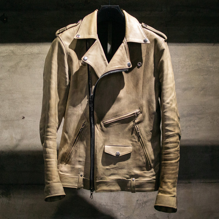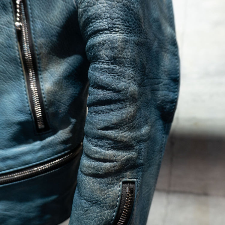 STRUMのレザーは食用の副産物の皮から作られ、人間が生きるために命を頂いた動物たちの皮も無駄にせず、動物への感謝も込めて一点一点丹精込めて作る、という理念が現れたかのような色合いになり、全てを包括する母なる地球に対する感謝を再認識させてくれた革ジャン。