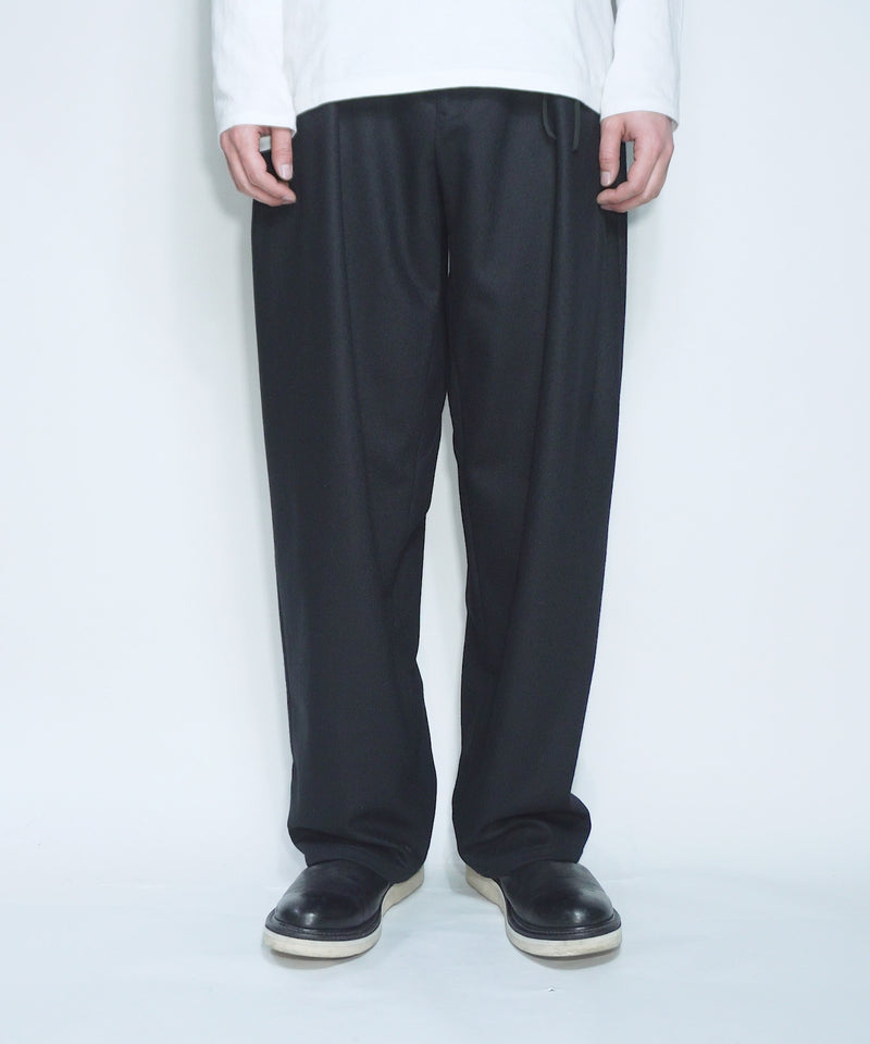 カシミア混 ストレッチ リサイクルウール ツイル バレル ワイド パンツ - BLACK
