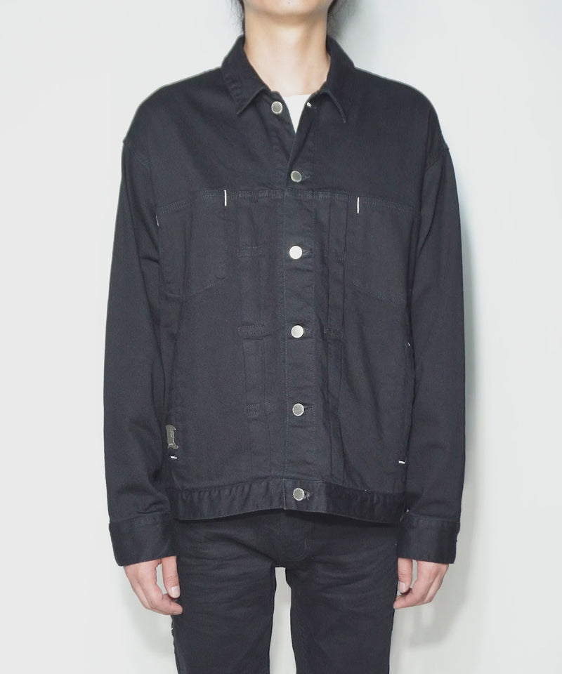 各所に様々なディテールを落とし込み、ブラックデニムとホワイトステッチ・メタルパーツのコントラストが映える、洗練された大人の雰囲気を持ったデニムジャケットです。
