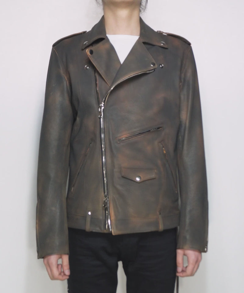 白鞣し × ベジタブルタンニン鞣し カーフ スキン Burning dyed - 製品燃焼染め ROM ダブルライダースジャケット - IRON RUST