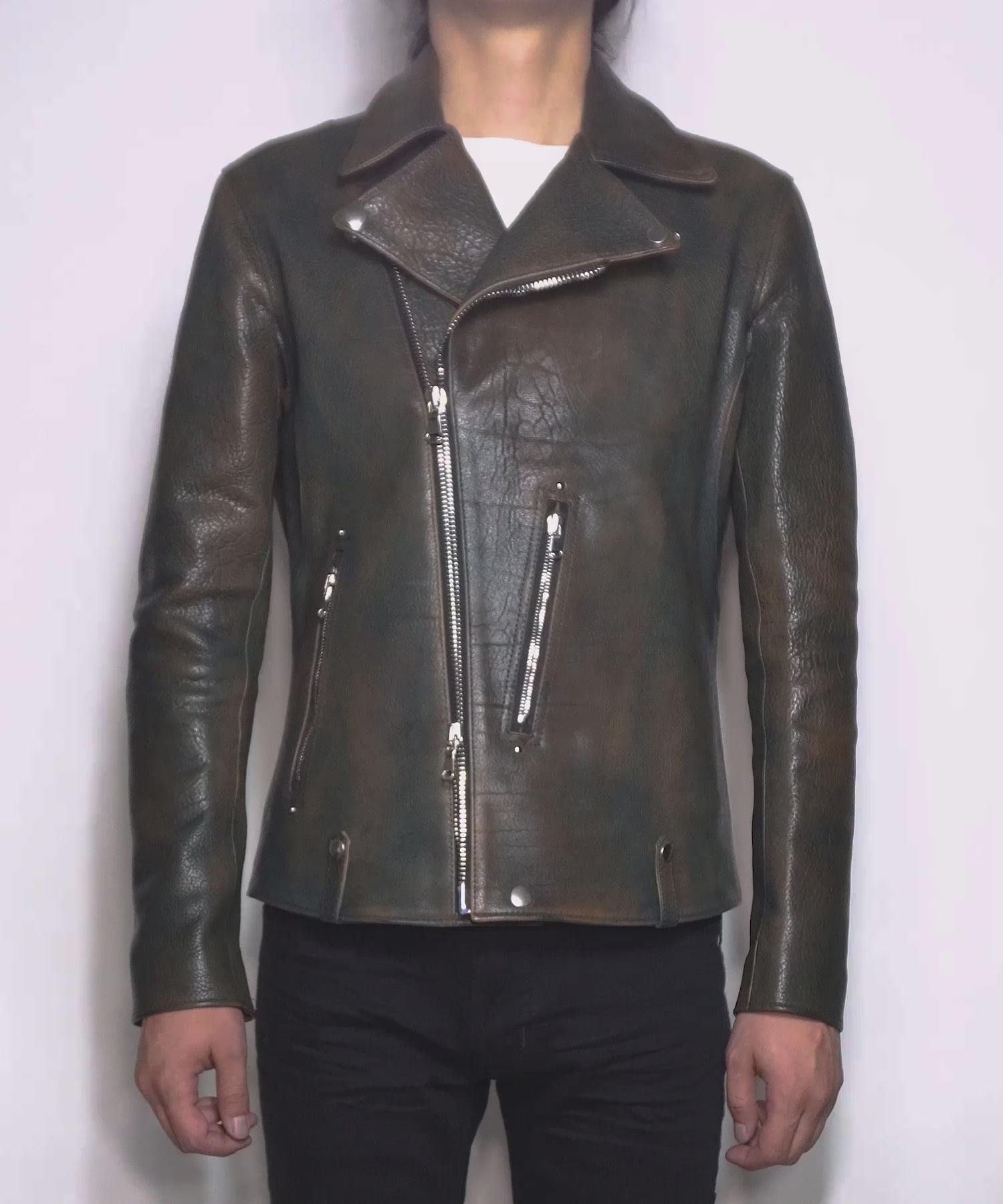 背面は牛革の背中心が、ライダースの背中心に来るよう裁断し縫製。これにより背中の中心からダブルショルダーのシボが全身を纏うように広がる、傷や表情を生かしたシリーズです。
