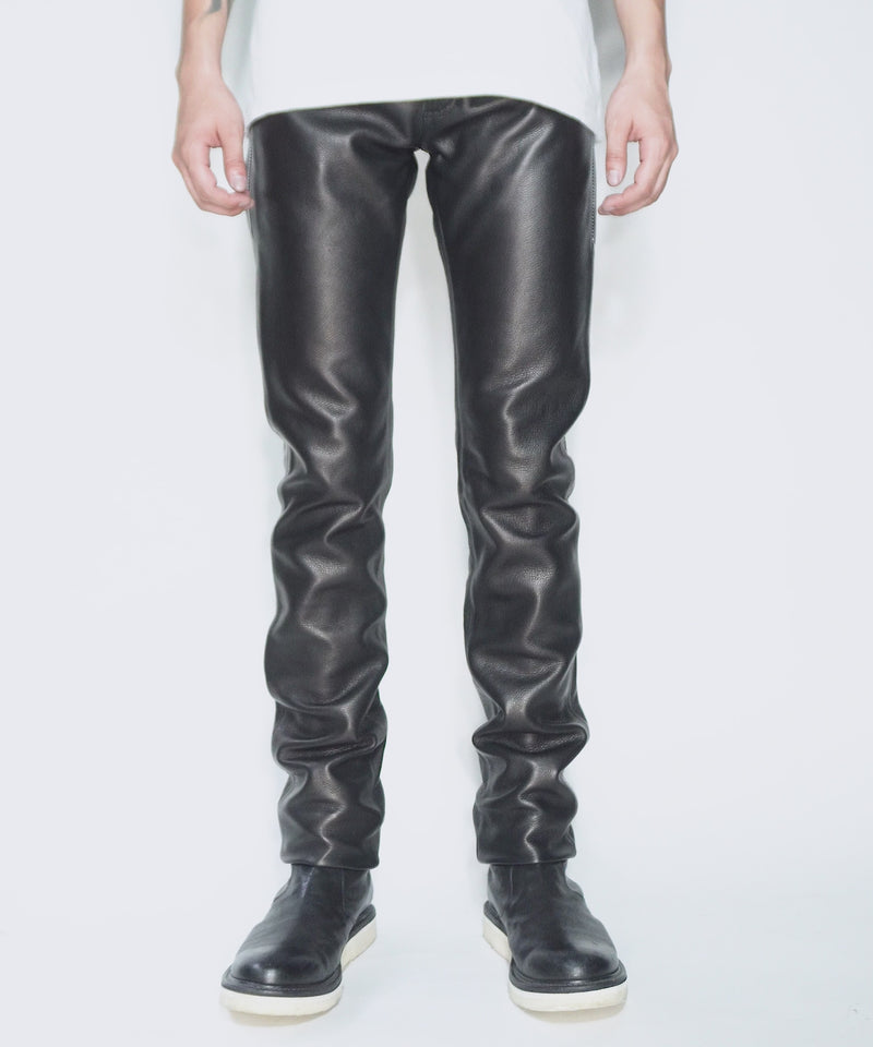 耐水性と堅牢さを備えた、程よい厚みのカウレザーで仕立てるSTRUM初のレザーパンツ。